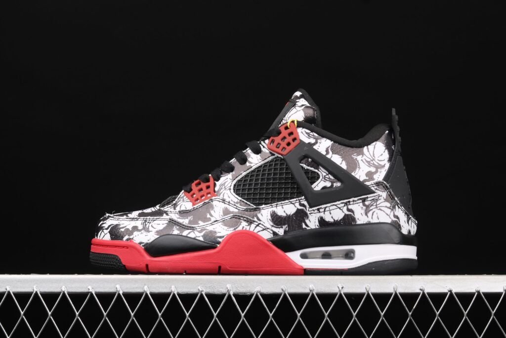 Consulta nuestro catalogo Máxima Calidad: fábrica Nike OEM en VietnamLas zapatillas Air Jordan 4 Retro ‘Tattoo’ llevan la silueta icónica a sus orígenes calzado de baloncesto de alto rendimiento. La parte superior está hecha de cuero blanco más detalles negros la entre suela roja está completamente cubierta con un estampado de baloncesto en blanco y negro, con toques y contrastantes de Fuego Rojo en los ojales moldeados y la suela exterior. La paleta de colores inspirada en los Chicago Bulls tiene un acabado negro básico y el talón con el grabado su logotipo. Un diseño para los más atrevidos.