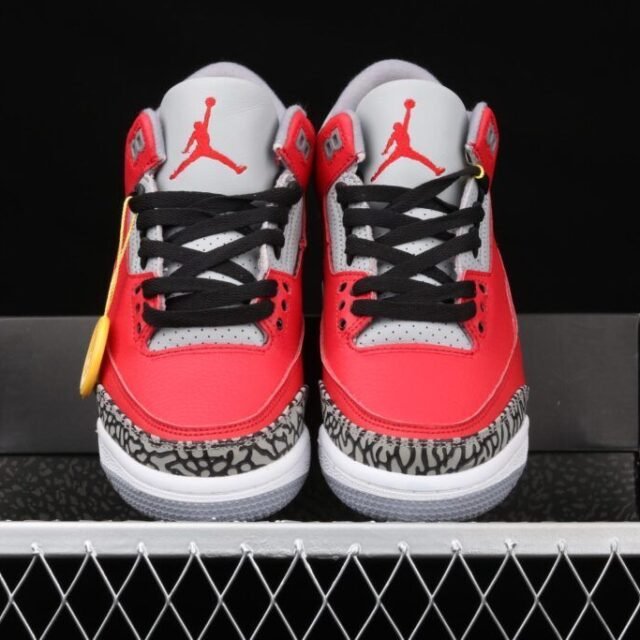 Las zapatillas Air Jordan 5 Top 3 Púrpura, Negras, Rojas están fusionadas logrando unas combinaciones de colores más pronunciados. El color morado, el color rojo fuego y el negro metálico están todos incorporados en el diseño de estas zapatillas. En la parte superior predomina el color negro que está compuesto por piel de nebuck que da un aspecto negro metálico. La red translúcida se encuentra en el panel central, mientras que la lengüeta está inspirada en el maravilloso diseñado en color morado La marca roja 23 es bordada, así como el logo Nike Air blanco que se encuentra en el talón La ventana Air en el talón está encerrada dentro de una entre suela de color rojo fuego que presenta detalles de dientes de tiburón de cemento.