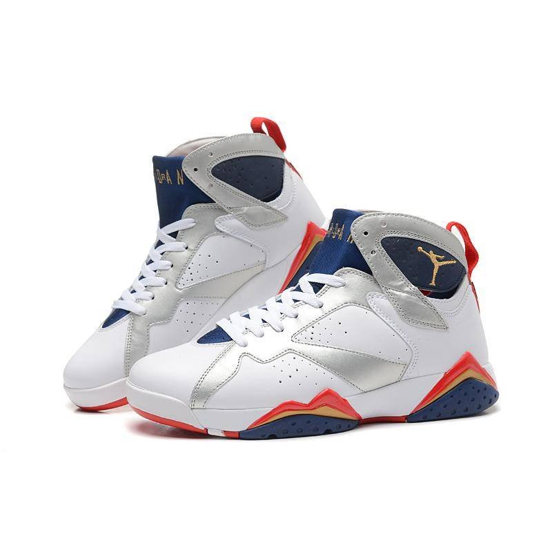 Las zapatillas Air Jordan 7  Olipic Retro estan hechas de cuero parte delantera, el logo en los laterales con los colores de la bandera de los Estados Unidos ,blanco ,rojo y azul la suela es de Goma y el cuero es 100%