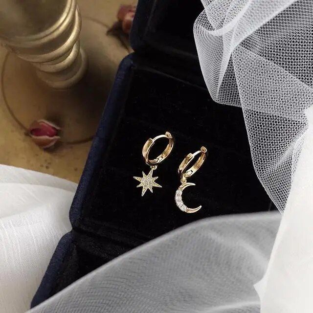 What sets these earrings apart is their unique asymmetric design, combining the celestial beauty of stars and moons. The use of sparkling crystals adds a luxurious touch, while the copper alloy ensures durability and longevity. These earrings are not just accessories; they’re a statement of style and sophistication.