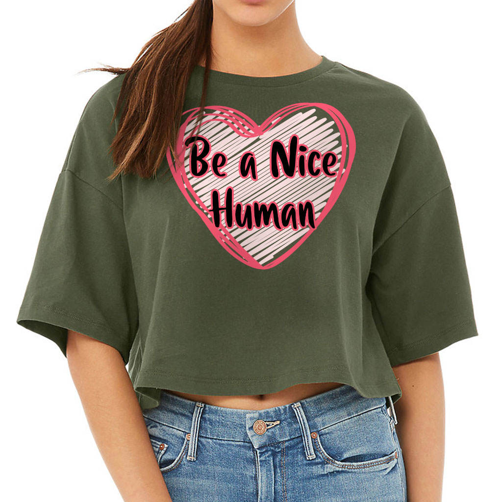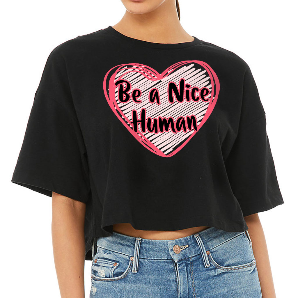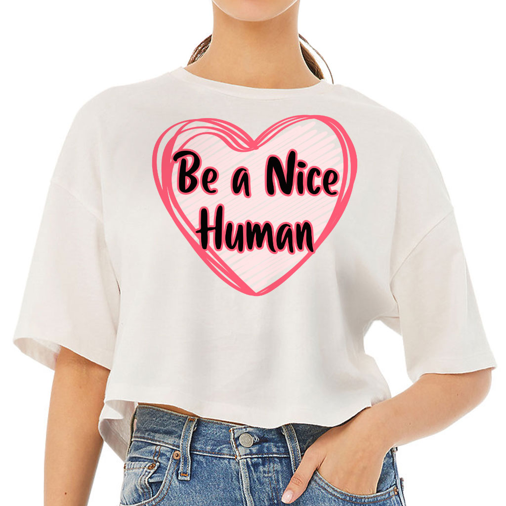 Be a Nice Human Women’s Crop Tee Shirt If you’re looking for a must-have item to add to your wardrobe, Heart Print is a perfect choice! This comfy cropped t-shirt offers all-day comfort with its side seam and mid-length design. Plus, the retail fit provides an aesthetically pleasing appearance while still…