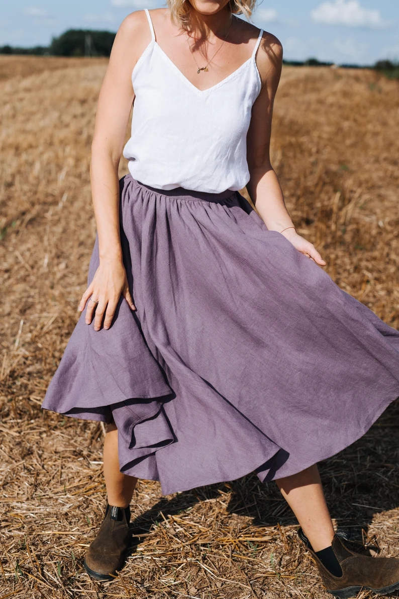 Se ve bien, mezcla de algodón y lino. Aproximadamente 53 cm en el dobladillo, tamaño L.