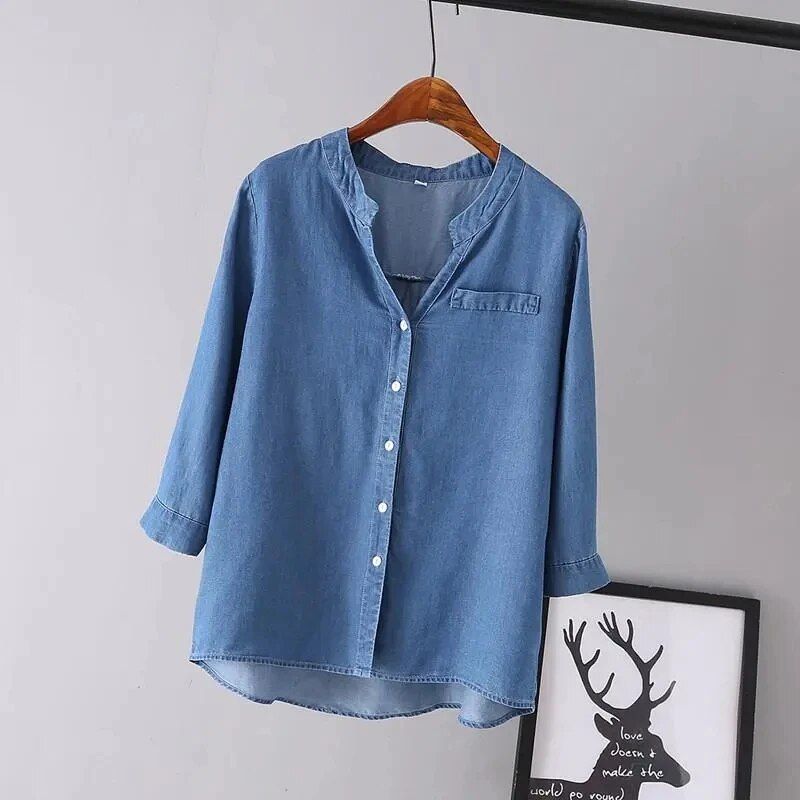 The beauty of this blouse lies in its simplicity and its finer details. Featuring a relaxed straight cut that flatters every figure, the three-quarter sleeves keep you cool and comfortable as temperatures rise. The single-breasted closure adds a classic touch, while the understated solid color design allows for endless styling possibilities. Perfect for those aged 25-34 but versatile enough for any woman who values style and comfort.When to Wear Your Denim Blouse