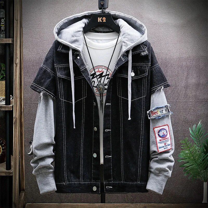 Our Men’s Hooded Denim Jacket stands out with its hip hop-inspired appliques, offering a personalized touch that makes each piece unique. The ingenious combination of denim and knit sleeves not only sets it apart in design but also in comfort, providing a snug fit that’s just right for the transitional weather of spring and autumn.