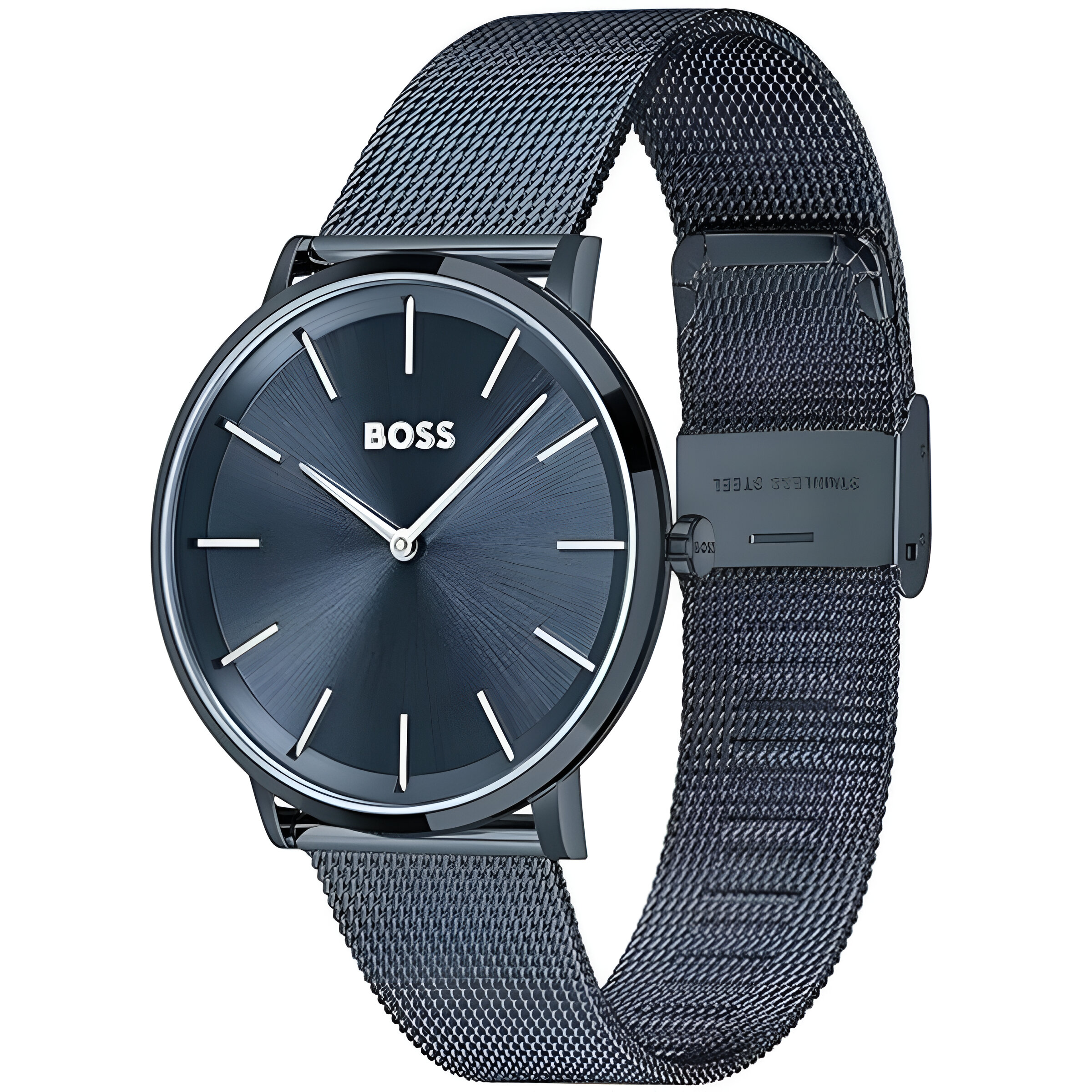 Make a bold statement with this Hugo Boss Elegant Blue Stainless Steel Quartz Watch, a timepiece that blends modern sophistication with timeless appeal. Featuring a deep blue stainless steel case and matching blue stainless steel bracelet, this watch is designed for those who appreciate sleek aesthetics and precision craftsmanship. The 37MM blue dial completes the monochromatic look, offering a refined yet eye-catching accessory for any occasion.