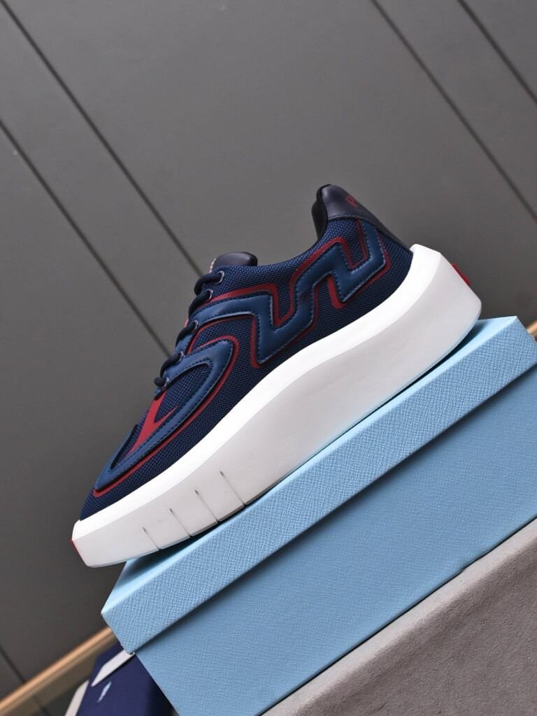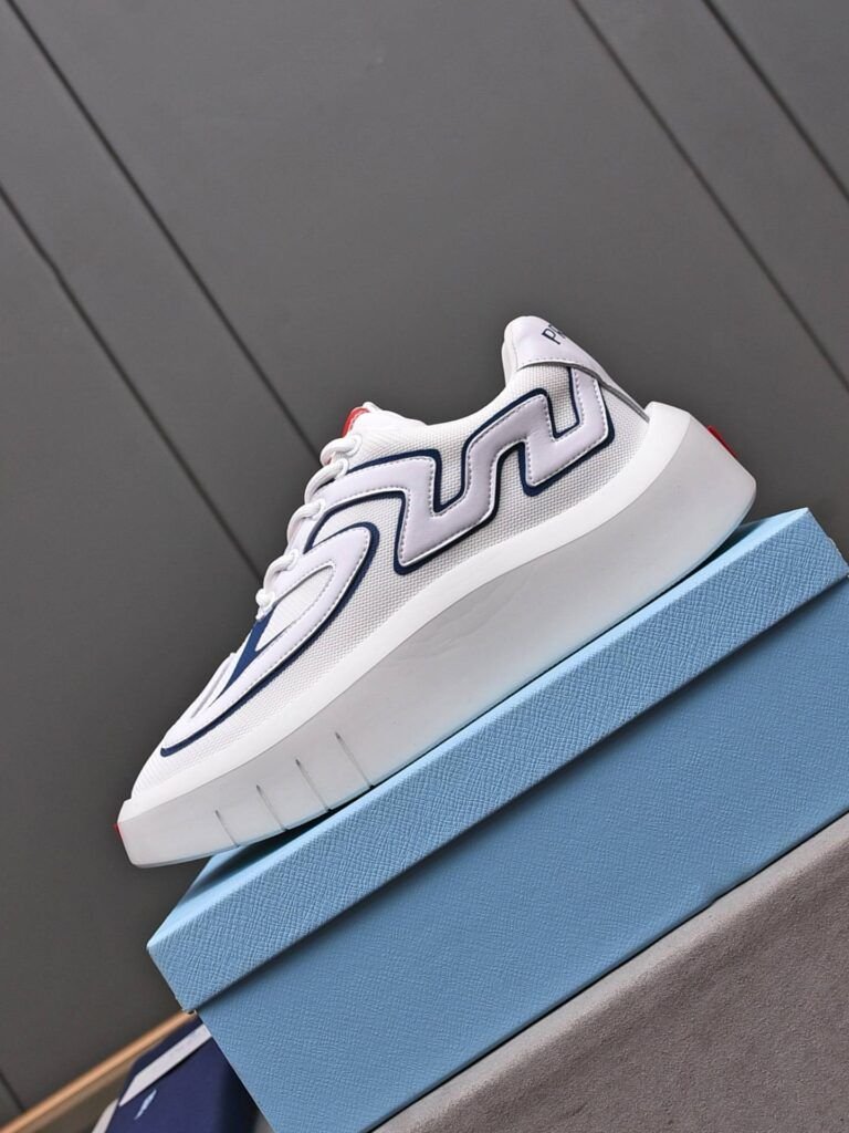Las zapatillas son casuales de suela gruesa para hombres de Prada están hechos de piel de becerro de primera capa importada unida con malla transpirable para una vista sin obstáculos de la textura del cuero.De moda y generoso con almohadillas de cuero genuino para los pies. El forro de algodón es suave, cómodo y transpirable. Suela de goma de 4,5 cm de grosor. Diseño decorativo con logotipo clásico. El esmalte metálico triangular está adornado con detalles únicos en los laterales . Un par de zapatillas informales más altas y elegantes son imprescindibles para la calle.