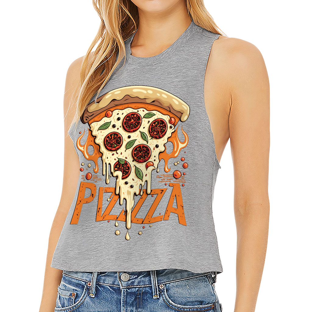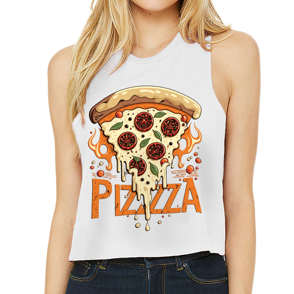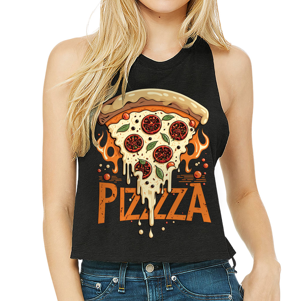 Pizza Graphic Racerback Cropped Tank Show off your style with Trendy! This cool and comfortable top is just what your wardrobe needs. Featuring a side-seamed relaxed fit that falls softly from the shoulders to a cropped finish, it’s perfect for flaunting your figure. Brass-colored raw edge arm holes and a racerback…