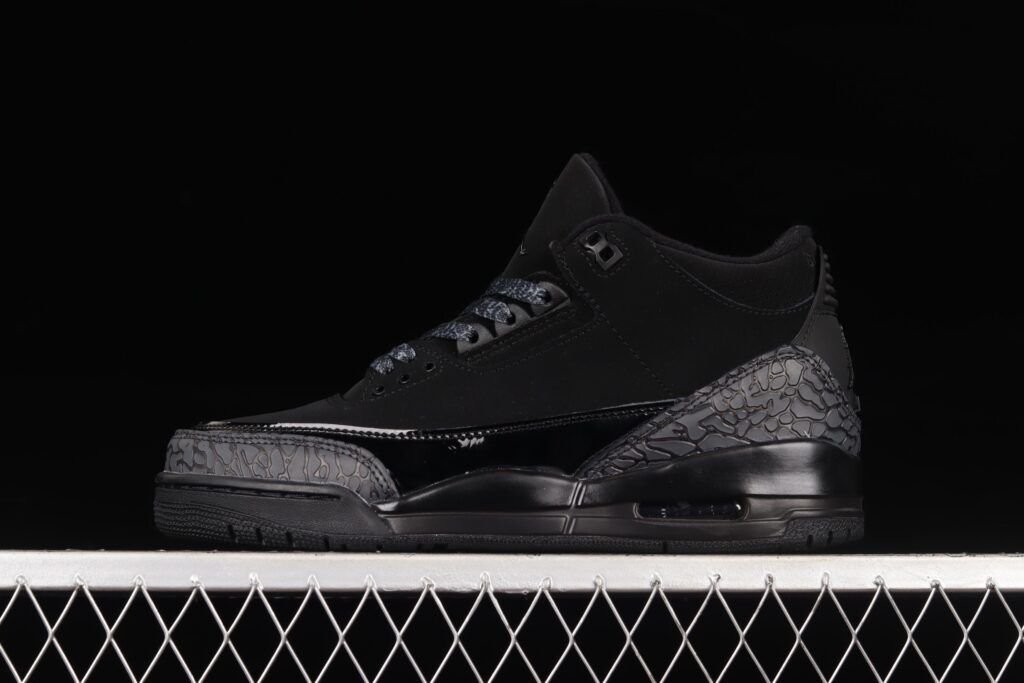 Las zapatillas Air Jordan 3 «Cemento negro» son de color negro y predomina en la parte superior el ante con una suela de goma ,podemos ver el logotipo en la lengüeta también en color negro .Zapatillas cómodas y destacadas por su color negro